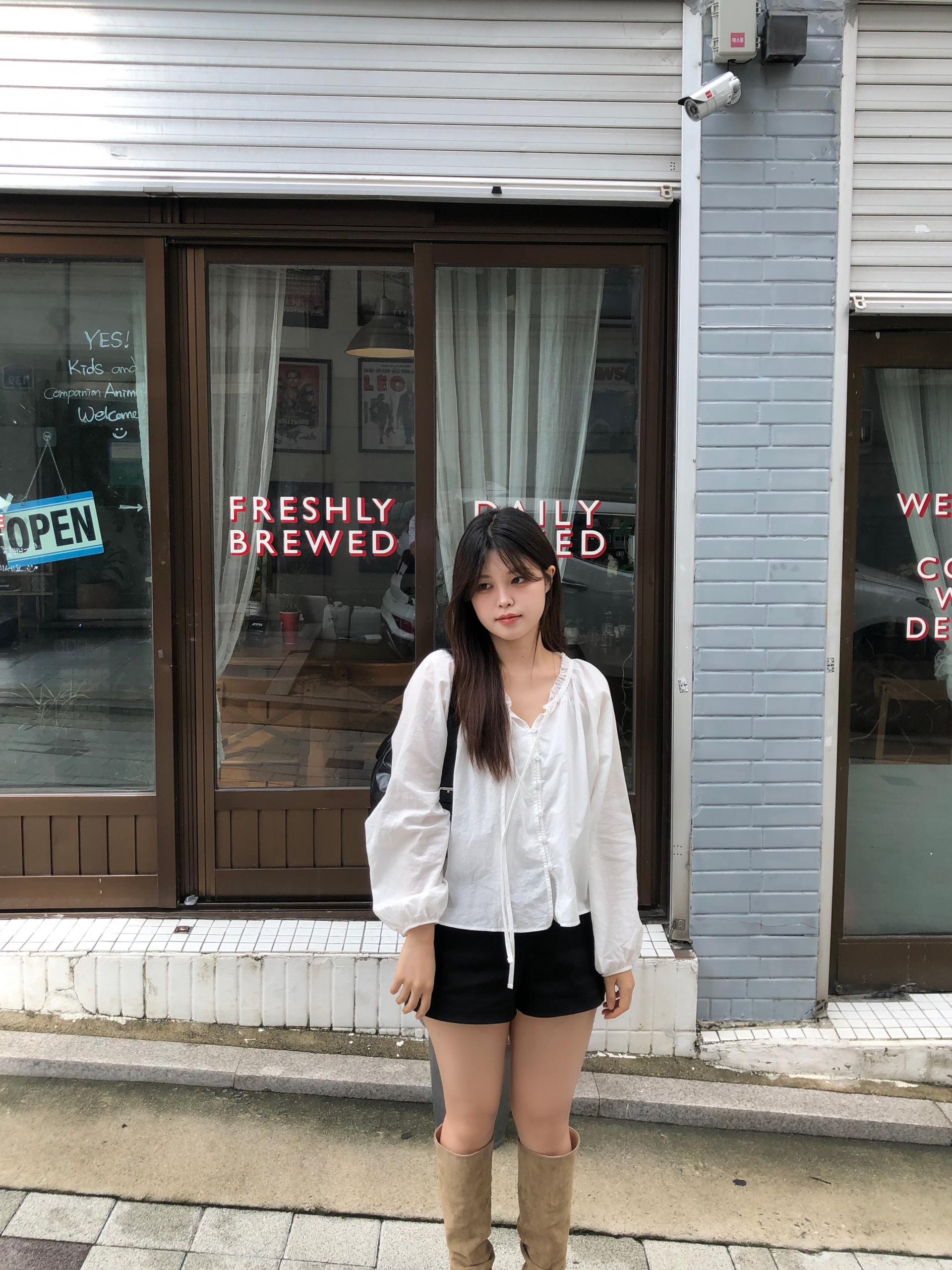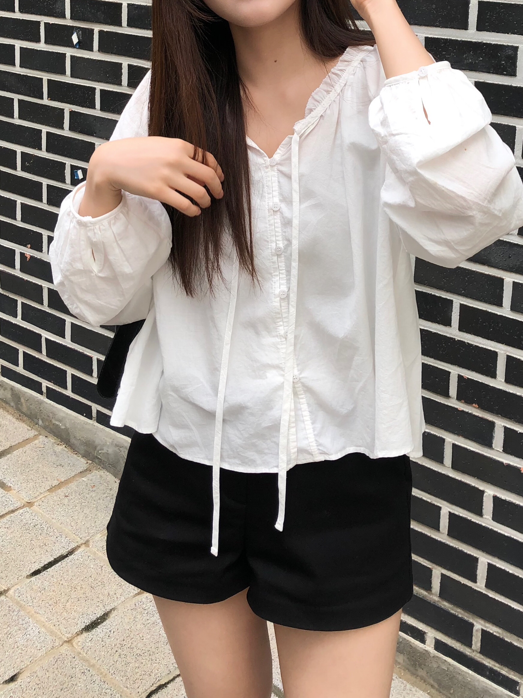 넥라인의 스트링과 버튼 포인트가 여성스럽고 러블리한 매력을 더해줍니다