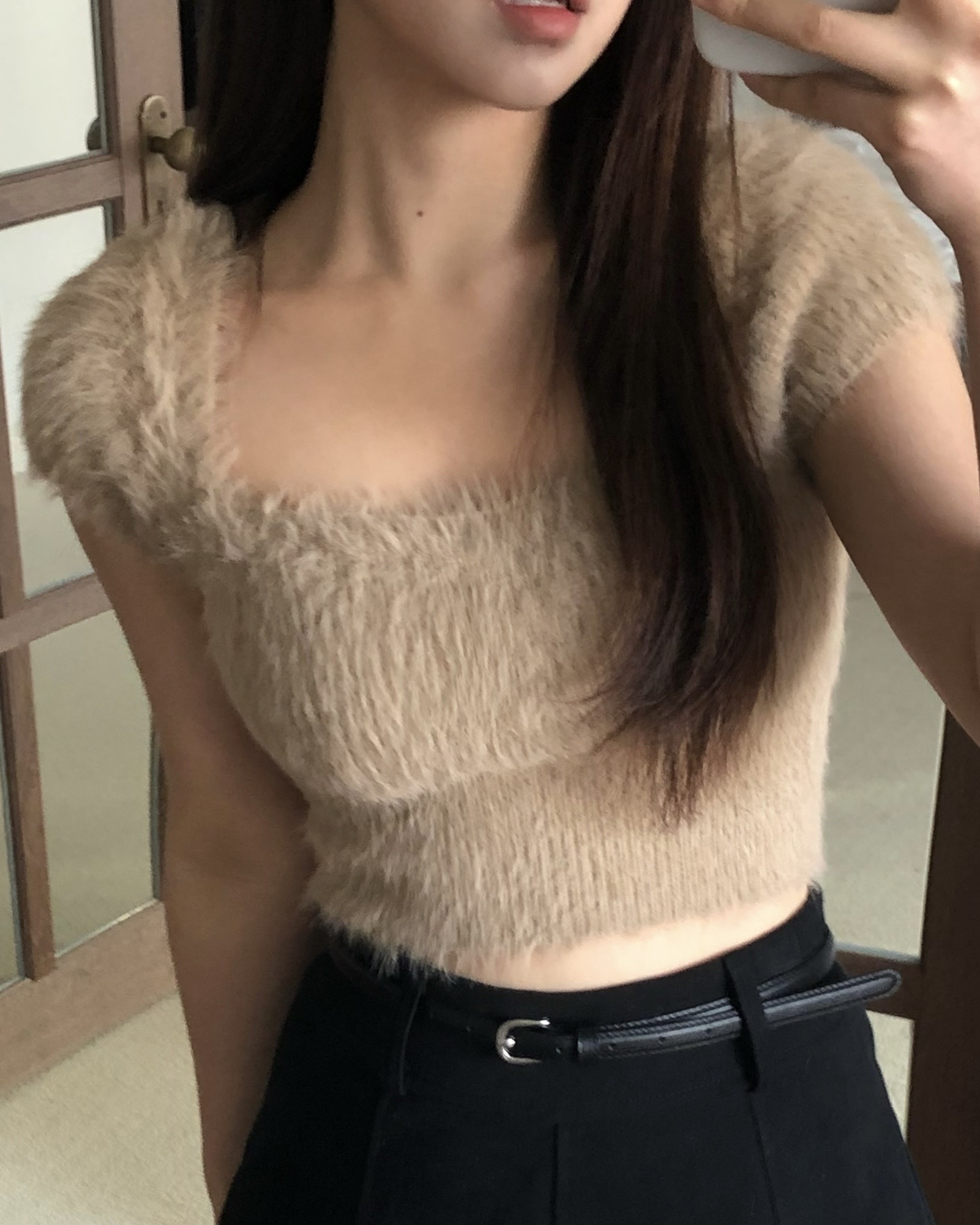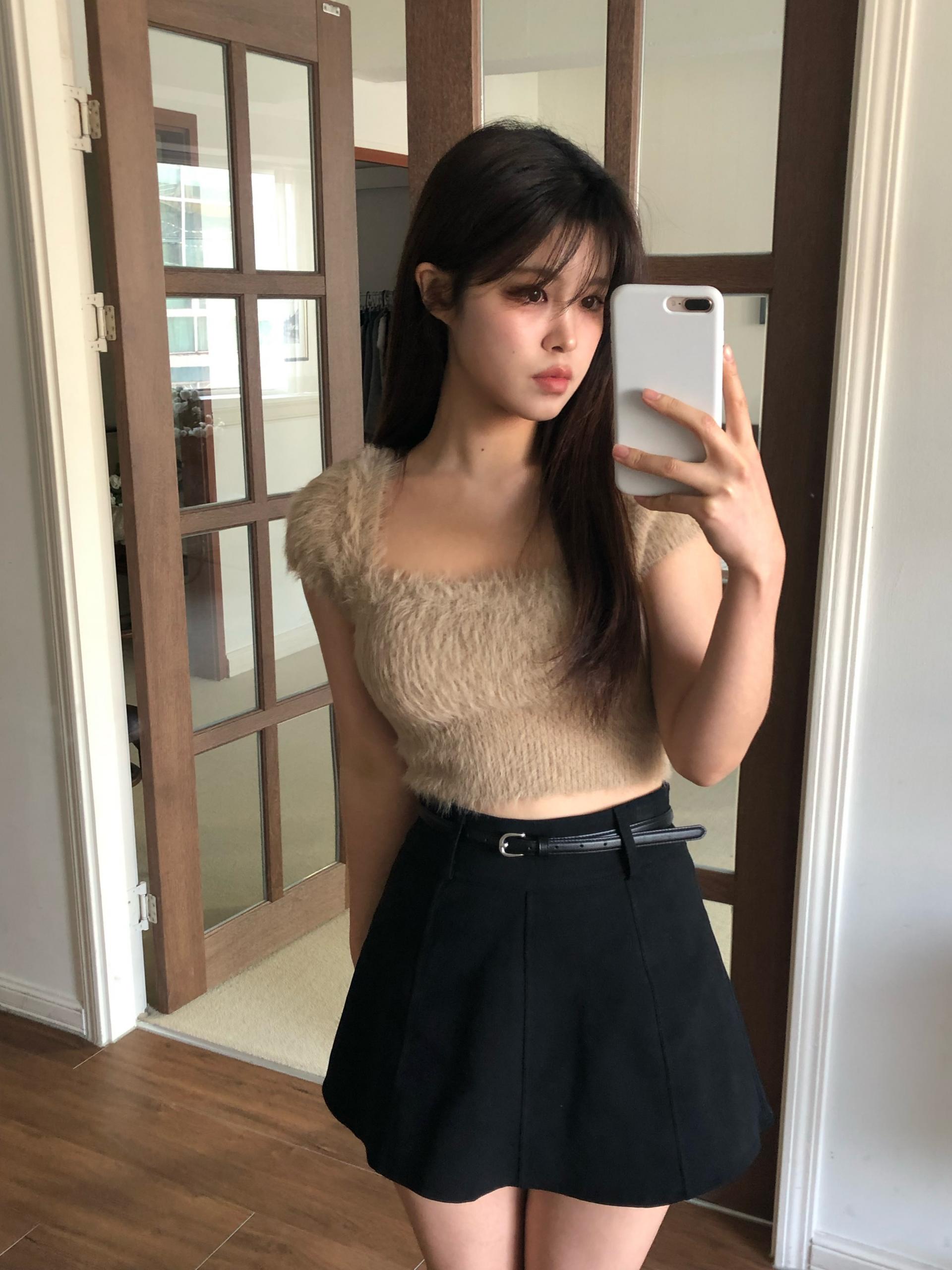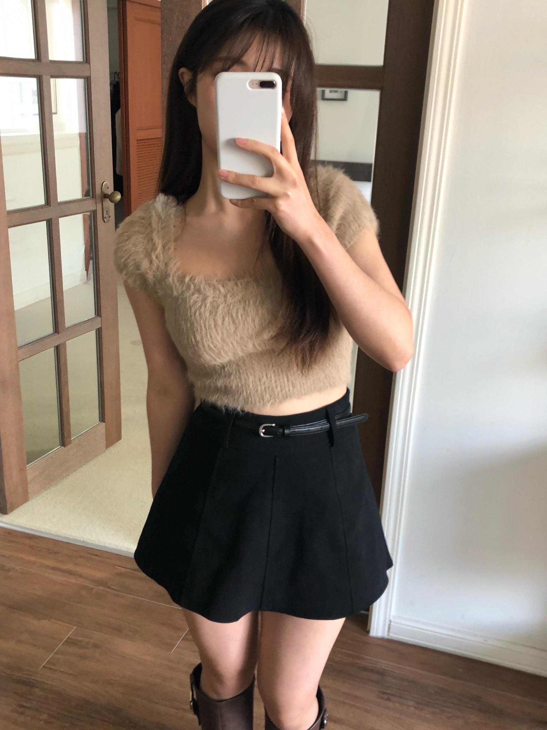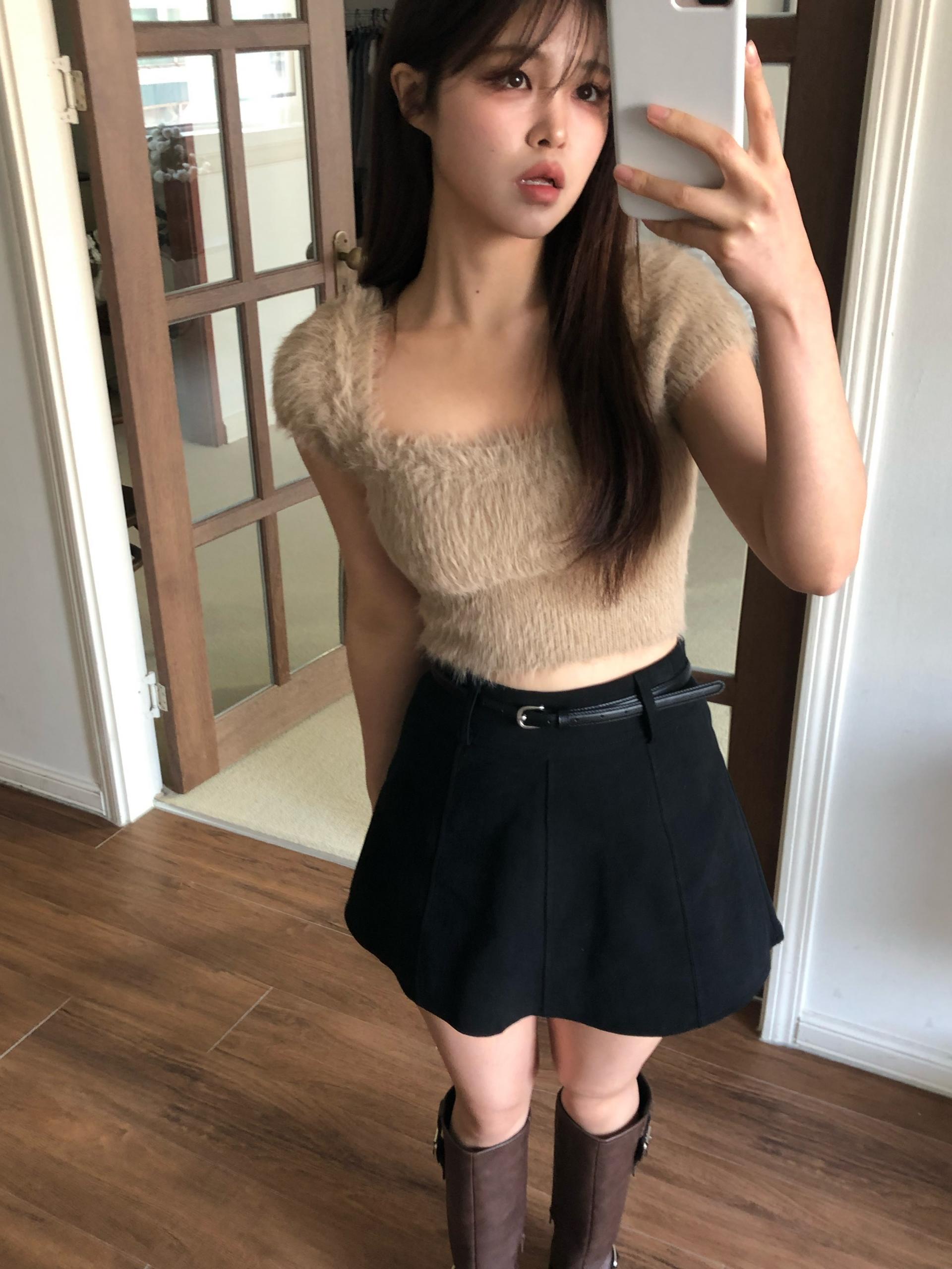 퍼 텍스처가 더해진 브러쉬 니트 소재로 포근하고 여성스러운 무드를 연출하며