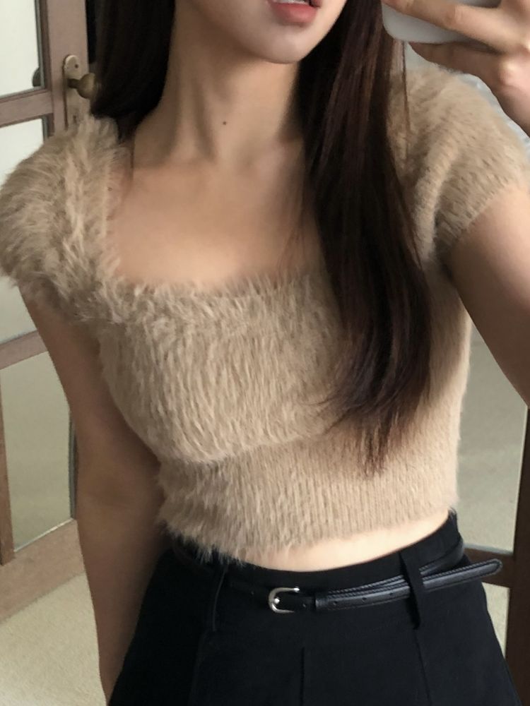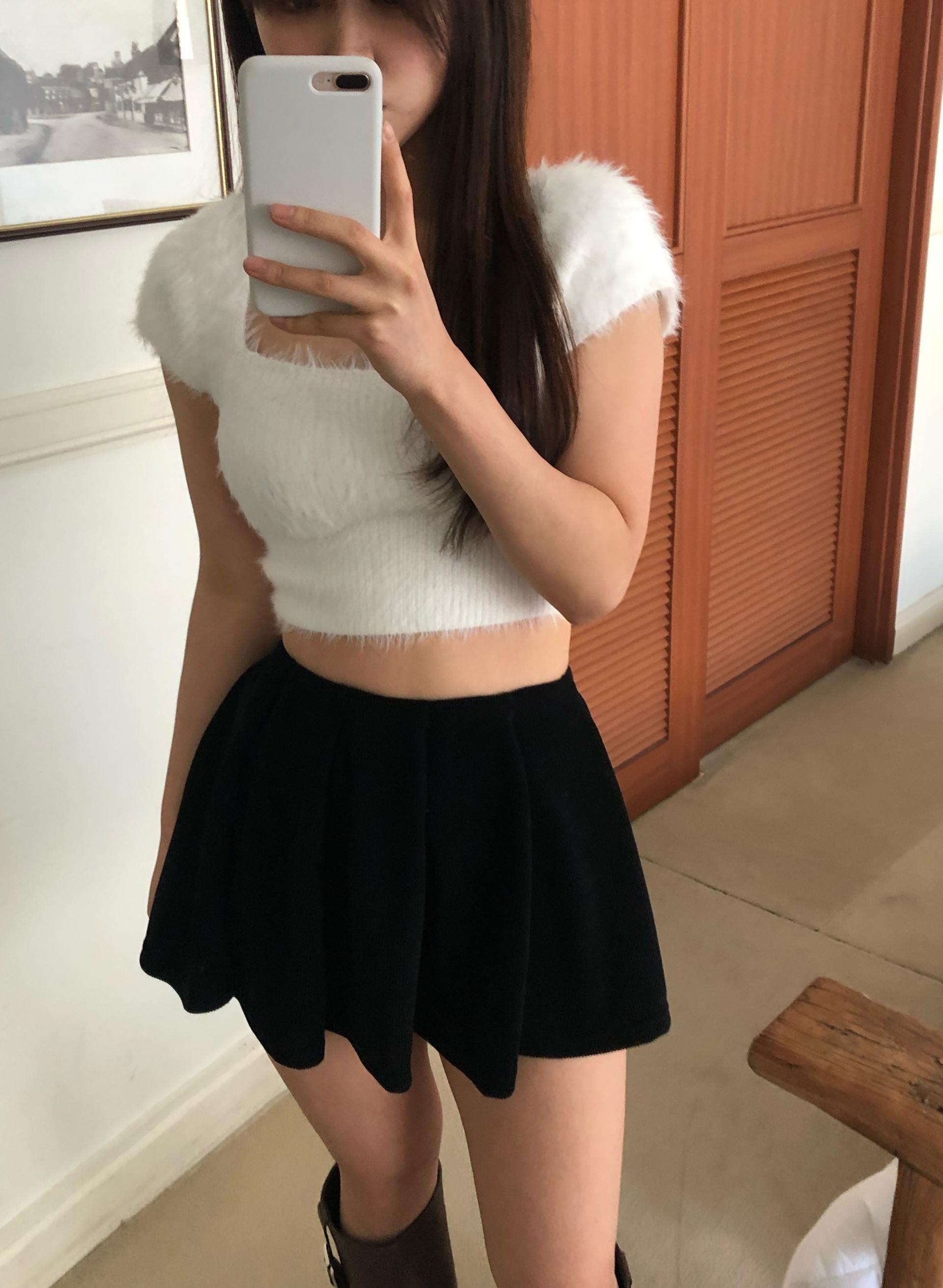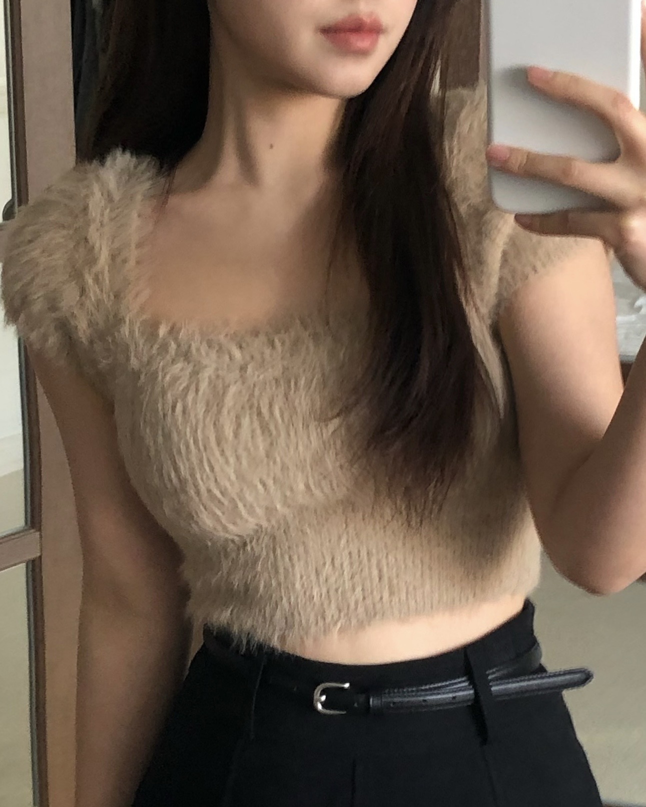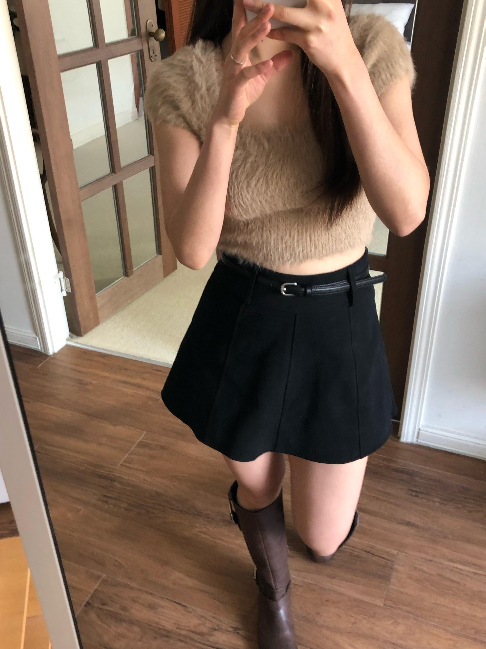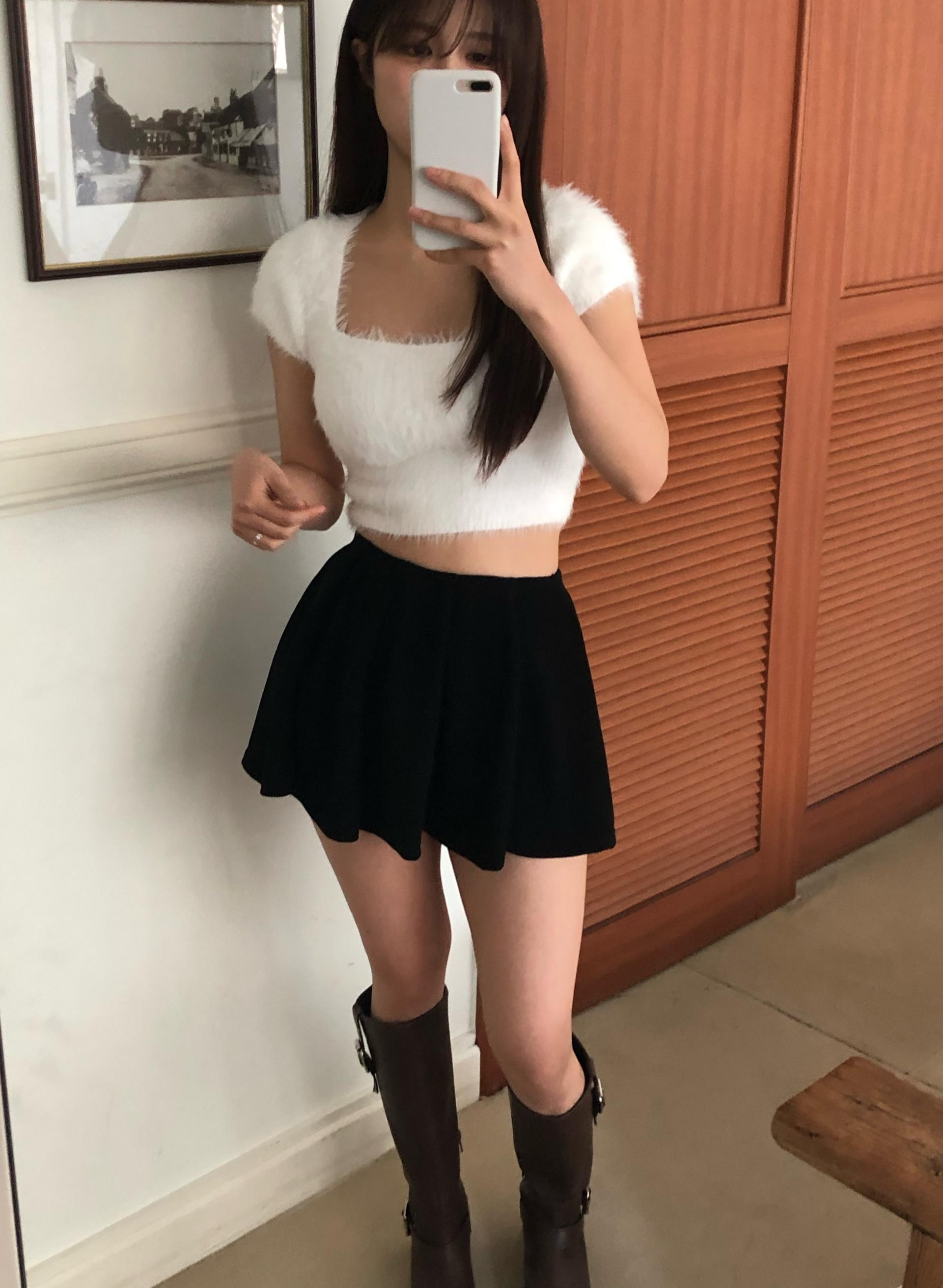 퍼 텍스처가 더해진 브러쉬 니트 소재로 포근하고 여성스러운 무드를 연출하며